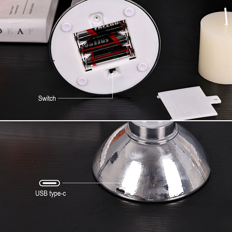 3 AAA batérieNovo navrhnuté zamračené nočné svetlo s tienidlom na sviečku má na vrchu dekoratívnu sviečku, ktorú možno zapáliť na osvetlenie, priehľadnú sklenenú fľaštičku v strede, ktorá obsahuje tekutinu so špecifickým materiálom. Vo vnútri kvapaliny to vyzerá ako oblaky a hmla plávajúce na oblohe, veľmi podobné simulačnej práci. Spodná časť je kovová základňa, ktorú je možné použiť s 3 AAA batériami. Zamračené nočné svetlo so sviečkou je veľmi vhodné na dekoráciu interiéru alebo hotela a možno ho umiestniť aj do detských izieb s dobrým liečivým účinkom na náladu.