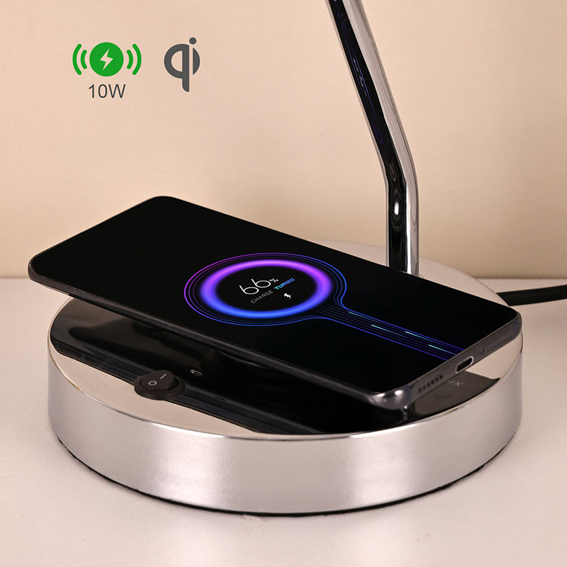 Stolná lampa s bezdrôtovou nabíjačkou má na základni ovládacie tlačidlo zapnutia/vypnutia