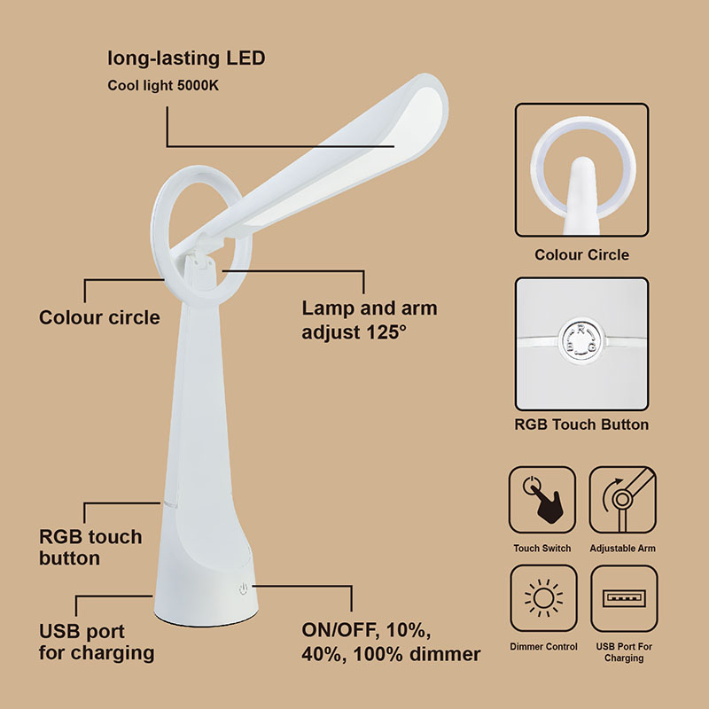 Dekor rgb led stolná lampa môže 3 stmievať späť na tele produktu. Hlava LED svetla sa dá otvoriť o 125° max.
