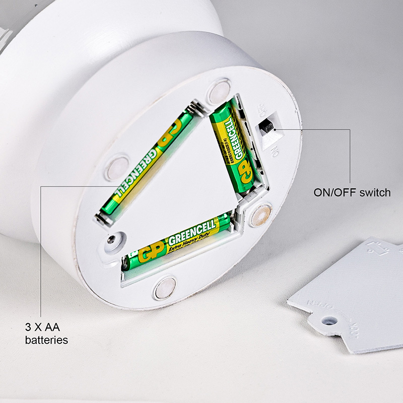 Nie je potrebné zapájať; môže byť napájaný iba 3 AAA batériami, vyznačuje sa jednoduchou inštaláciou a flexibilným použitím. Či už položený na nočnom stolíku, stole, detskej postieľke alebo pri kempovaní