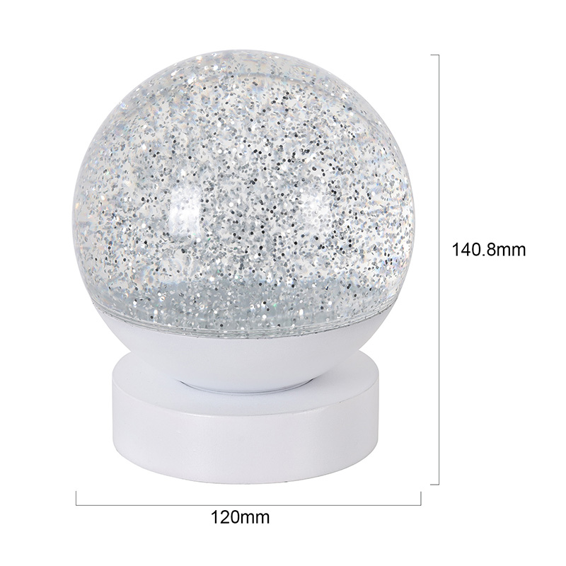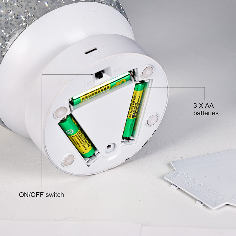 LED RGB trblietavá dekoračná lampa je vyrobená z vysoko kvalitného akrylového materiálu s priesvitnou guľou s vynikajúcou priepustnosťou svetla. Základňa je vyrobená z ekologického ABS plastu, ktorý zaisťuje stabilitu, odolnosť a bezpečnosť bez toxických látok. Funguje na tri vstavané batérie typu AAA (batérie sa predávajú samostatne), čím sa eliminuje potreba elektrickej zásuvky a ponúka sa pohodlné používanie. Ideálne na umiestnenie pri posteli, písacom stole alebo v detskom kútiku s hračkami. Pomocou jednoduchého dotykového spínača možno svetlo ľahko zapnúť alebo vypnúť, vďaka čomu je jeho samostatné ovládanie aj pre deti jednoduché.