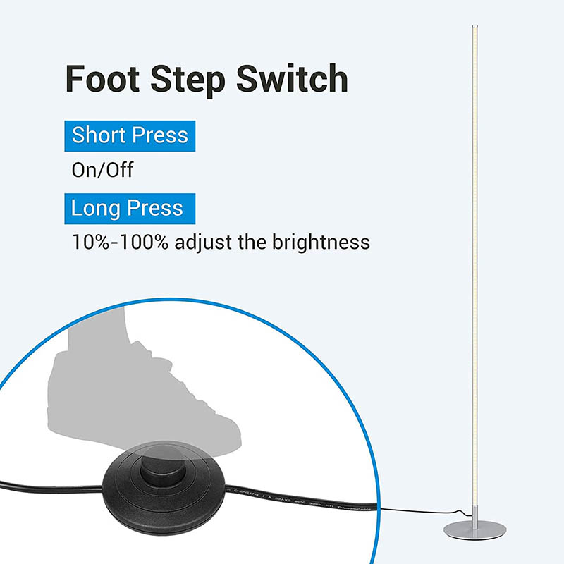 Naša stojaca LED lampa navrhnutá s ohľadom na pohodlie je vybavená nožným spínačom pre jednoduchú obsluhu. Lampa zapnete alebo vypnete jednoduchým stlačením spínača, vďaka čomu je ovládanie osvetlenia hračkou bez toho, aby ste museli tápať po tlačidlách alebo spínačoch. Tento premyslený dizajnový detail zlepšuje celkový používateľský zážitok a zaisťuje, že ovládanie lampy je čo najjednoduchšie a najintuitívnejšie.