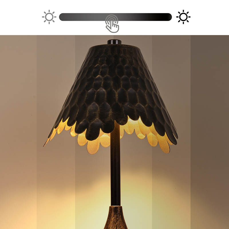 Vrcholom tejto lampy je jej nápadný dáždnikový vrchol, ktorý pripomína jemnú čiapku húb zdobenú zložitými vzormi zlatého listu. Tento dizajn nielenže dodáva do vášho okolia dotyk krásy inšpirovanej prírodou, ale slúži aj ako funkčný difúzny kryt pre zdroj svetla, čím vytvára mäkkú, dokonca žiaru, ktorá je príjemná pre oči.