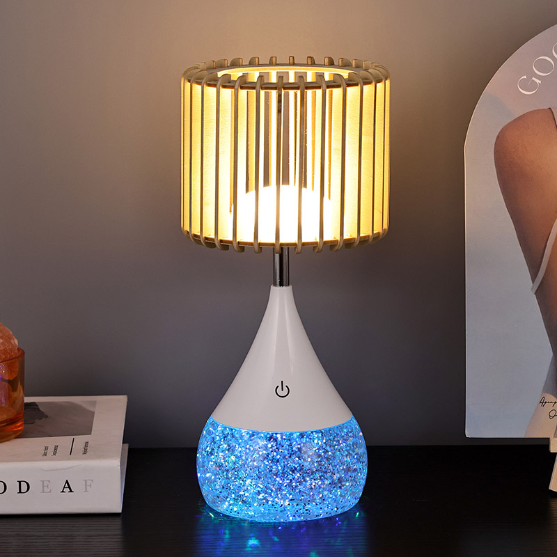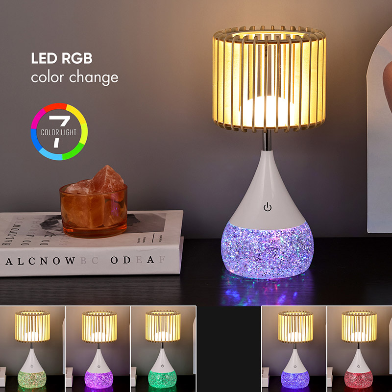 Dizajn:** Jedinečné drevené lamelové tienidlo, RGB farebne meniaca základňa