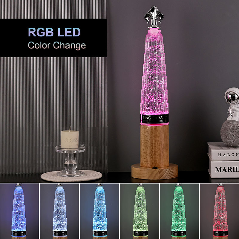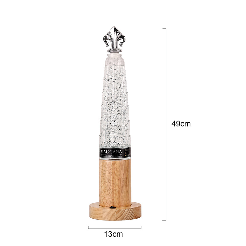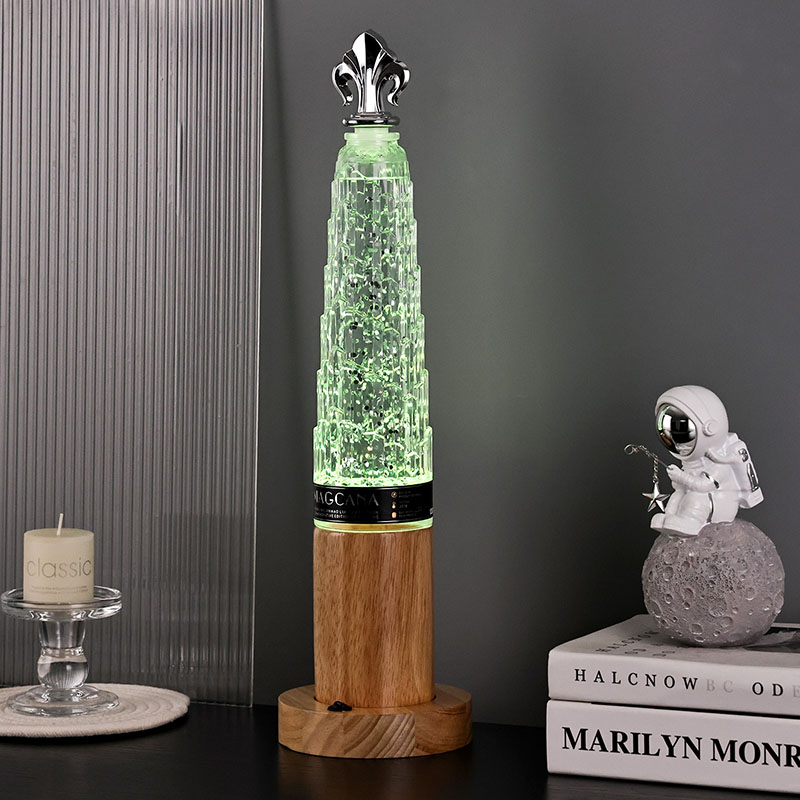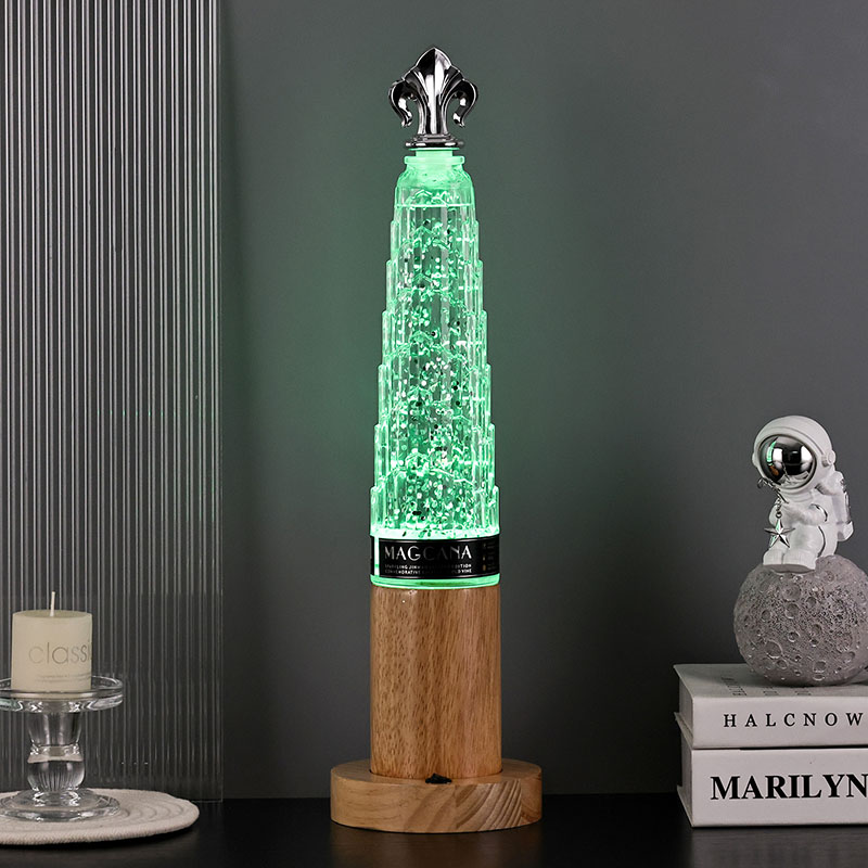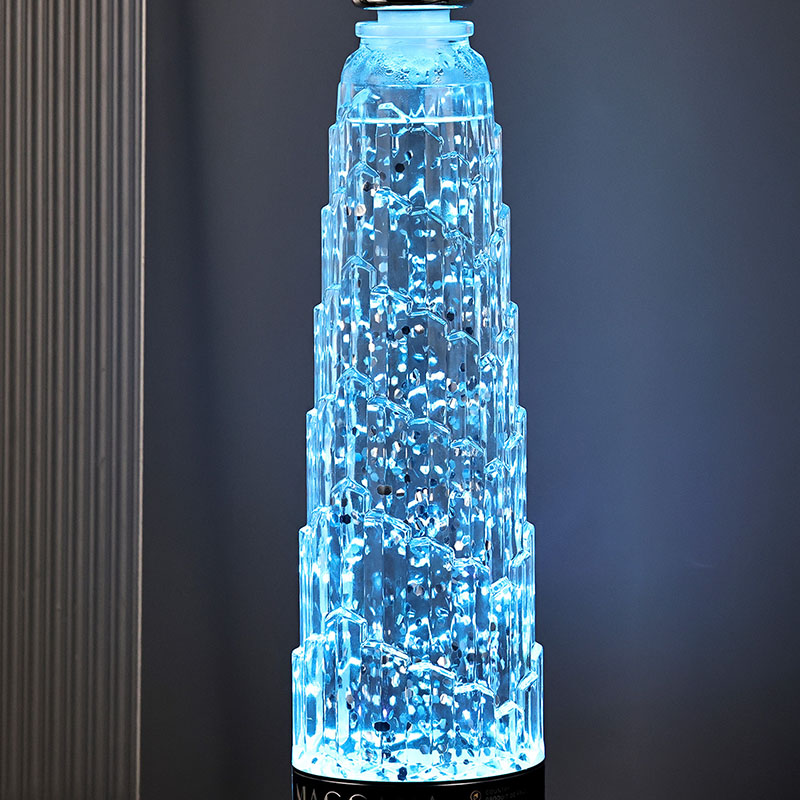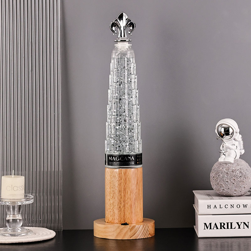 Trblietavá stolová lampa s vežovým tienidlom má klasický dizajn v tvare veže s nádhernými kovovými dekoráciami na vrchnej strane, jednoduchá, ale ušľachtilá. Priehľadná sklenená fľaša obsahuje tekutinu a