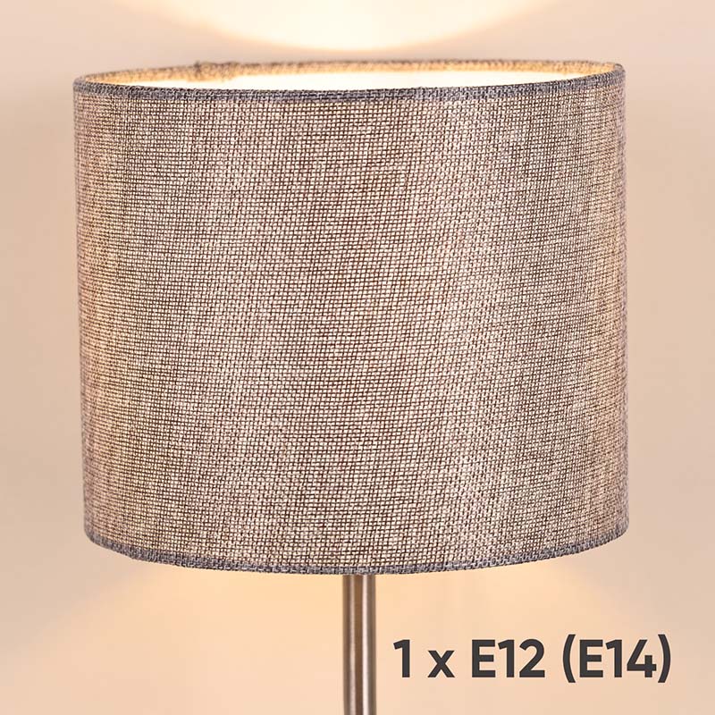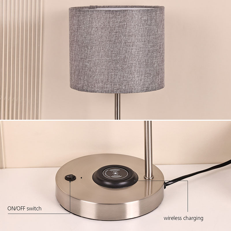 Vypínač ON/OFF na základniStolná lampa s nabíjačkou na bezdrôtový telefón s látkovým tienidlom využíva vysokokvalitný dizajn látkového krytu s jemnou a mäkkou látkou, čírou a prirodzenou textúrou, ktorá ľuďom dodáva pocit tepla a pohodlia. Látkový kryt dokáže nielen účinne rozptyľovať svetlo, čím je svetlo mäkšie a jednotnejšie, ale tiež znižuje oslnenie a podráždenie očí a chráni váš zrak. Šedý látkový poťah má jednoduchý a elegantný farebný tón, ktorý sa dokonale hodí k rôznym štýlom dekorácie interiéru a vytvára teplú a elegantnú atmosféru